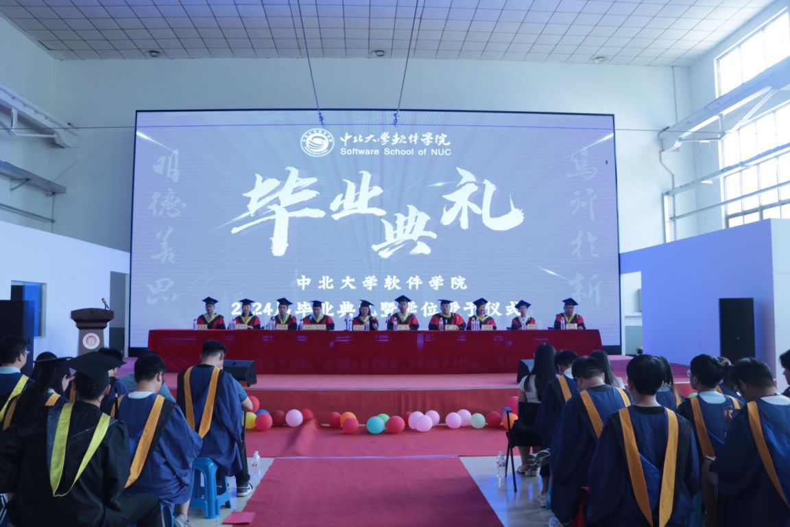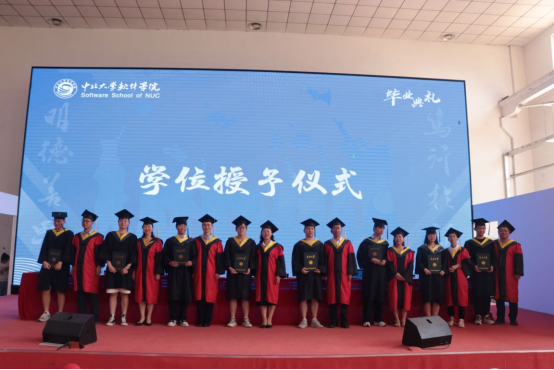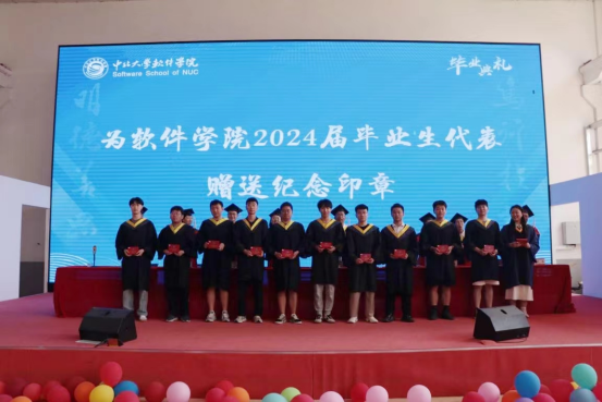 关于拟授予2024届毕业生学位的决定》,主席台学院领导和学位评定分委员会委员为2024届52名硕士生和771名本科生授予学位,硕士、学士学位获得者依次上台接受学位授予、拨穗礼,并亲切握手合影留念。学院精心为全体毕业生准备了毕业纪念印章,一方印章,心心相印,毕业生代表手捧着带有学院殷切期望和祝福的印章,脸上洋溢着喜悦和自豪的笑容,“软院情”在仪式中愈加浓厚!
