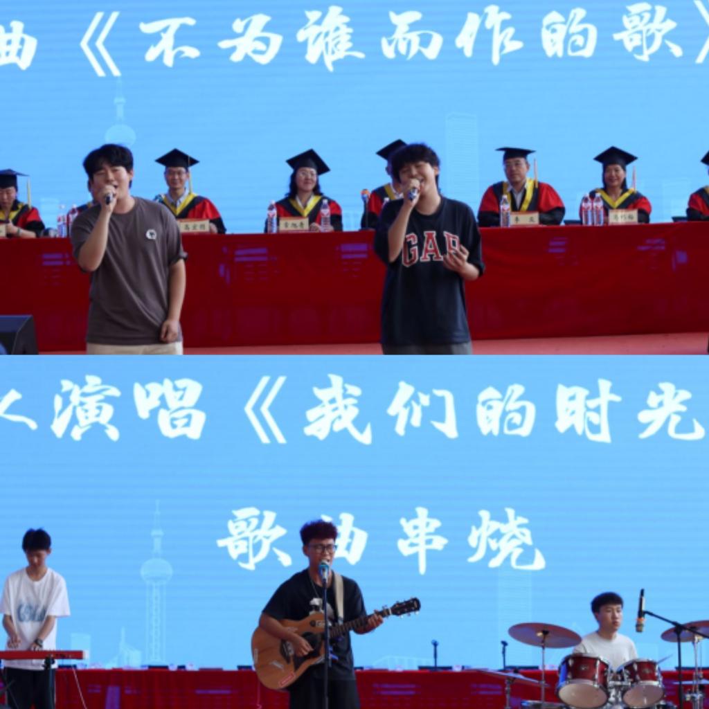 毕业典礼中,姚齐麟和于保瑞同学演唱的歌曲《不为谁而作的歌》以及国产调教