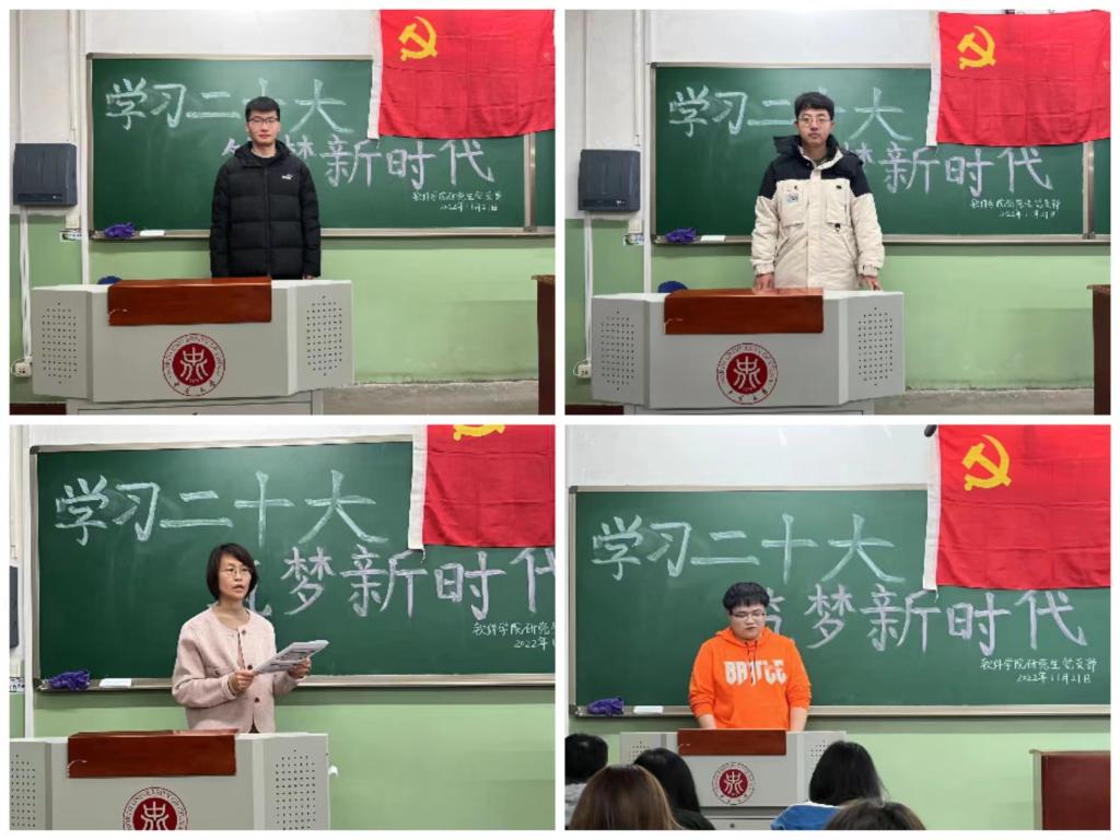 研究生党支部全体党员在01106H教室开展了以“学习二十大·筑梦新时代”为主题的党日活动。