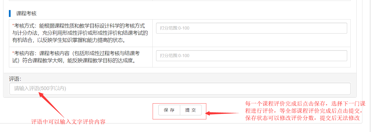 进入评价页面后,左边可以看到需要评价的课程和每门课程的评价状态,在评教过程选择具体课程,在右边的评价指标中进行评价,每评完一门课程后点击最下面的保存按钮进行保存,然后选择下一门课进行评价,全部课程评价完成后点击下面的提交按钮进行提交,提交后不能修改。(注:打分采用的是“百分制”)