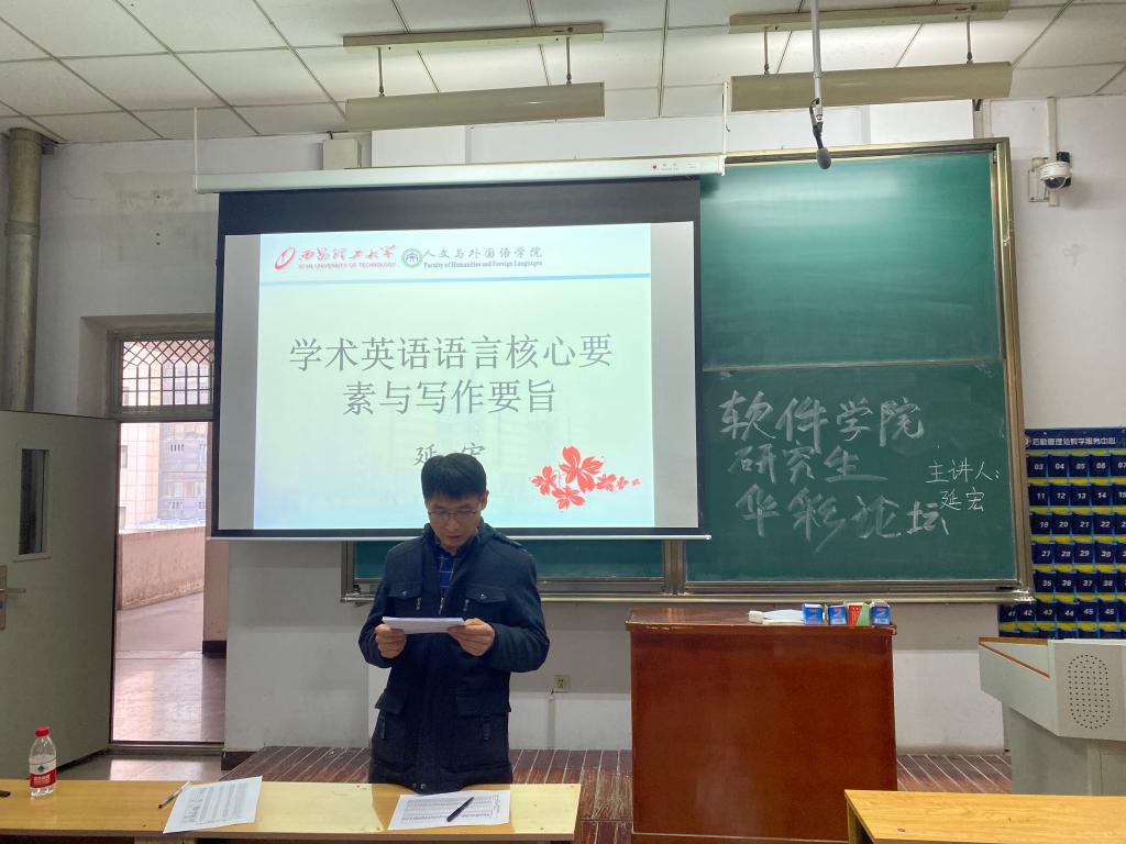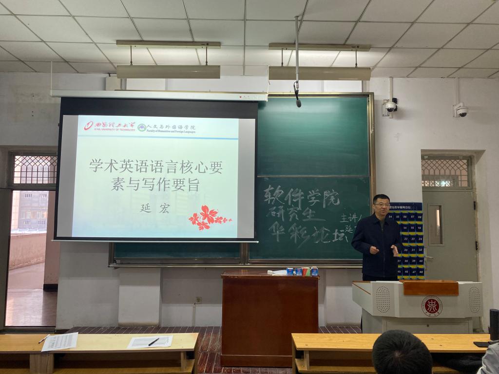 成功举办主题为“学术英语语言核心要素与写作要旨”华彩讲坛学术活动。此次讲坛有幸邀请到西安理工大学延宏教授,延教授是全国著名科技英语专家、西安理工大学学报编辑部英文译审,同时担任丝路翻译产业联盟总译审以及国家社科基金项目成果鉴定专家,其研究方向聚焦于学术英语翻译与写作。学院杜建海老师主持了活动。