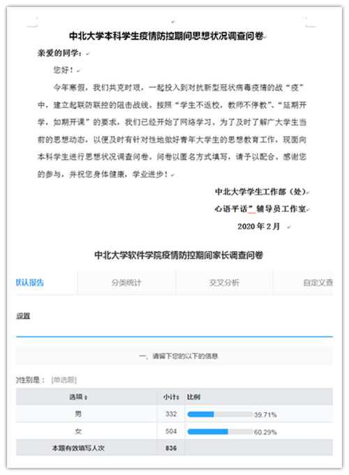 调查问卷的优势在于借助问卷的覆盖面广和灵活性强的特点,从多维度了解学生的疫情防控期间的思想学习和生活状况。调查问卷依托“心语平话”辅导员工作室开展,面向学生共收回问卷1120份、面向家长共收回问卷835份。问卷中有表现学生心理状况的“面对疫情,让我倾听您的心”;了解学生认知疫情的“守望相助,我们一起战“疫””;反馈延期开学的“关于延期开学和新学期的认识”;问卷中还有“停课不停学不停教”开展网上学习的过程中,通过家长的角度了解“开展网上学习的条件(如网速、流量等)是否能保障您的孩子的正常学习”、交流“对孩子自主学习和自我管理水平的满意度”、沟通“哪些是学校防疫亟需解决”……学生和家长在填写问卷的过程中本身就是了解学校如何在疫情特殊时期正确认识疫情,科学进行疫情防御,妥善保护自身安全的教育和引导。