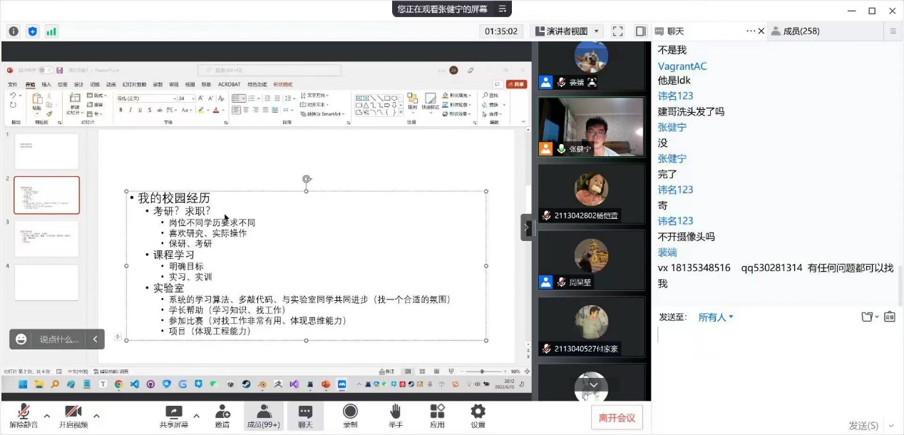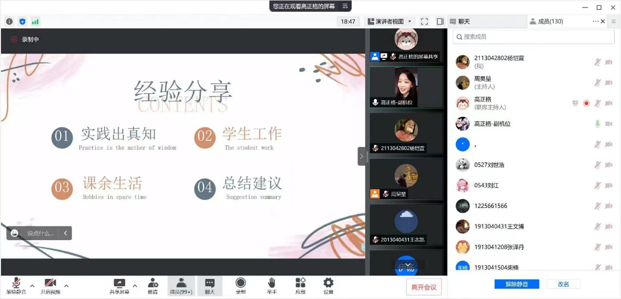 团委学生会主办的“榜样的力量”系列分享活动之应届毕业生“就业篇”分享会通过腾讯会议的形式线上开讲,本场活动邀请到了18级的两位优秀同学分享他们的就业经验,他们分别是18130045班的裴端同学和181300416班的张健宁同学。